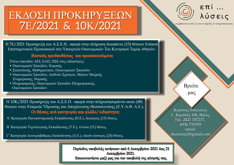 Πατήστε ΕΔΩ για να διαβάσετε ολόκληρη την προκήρυξη 7Ε/2021. Πατήστε ΕΔΩ για να διαβάσετε ολόκληρη την προκήρυξη 10Κ/2021.